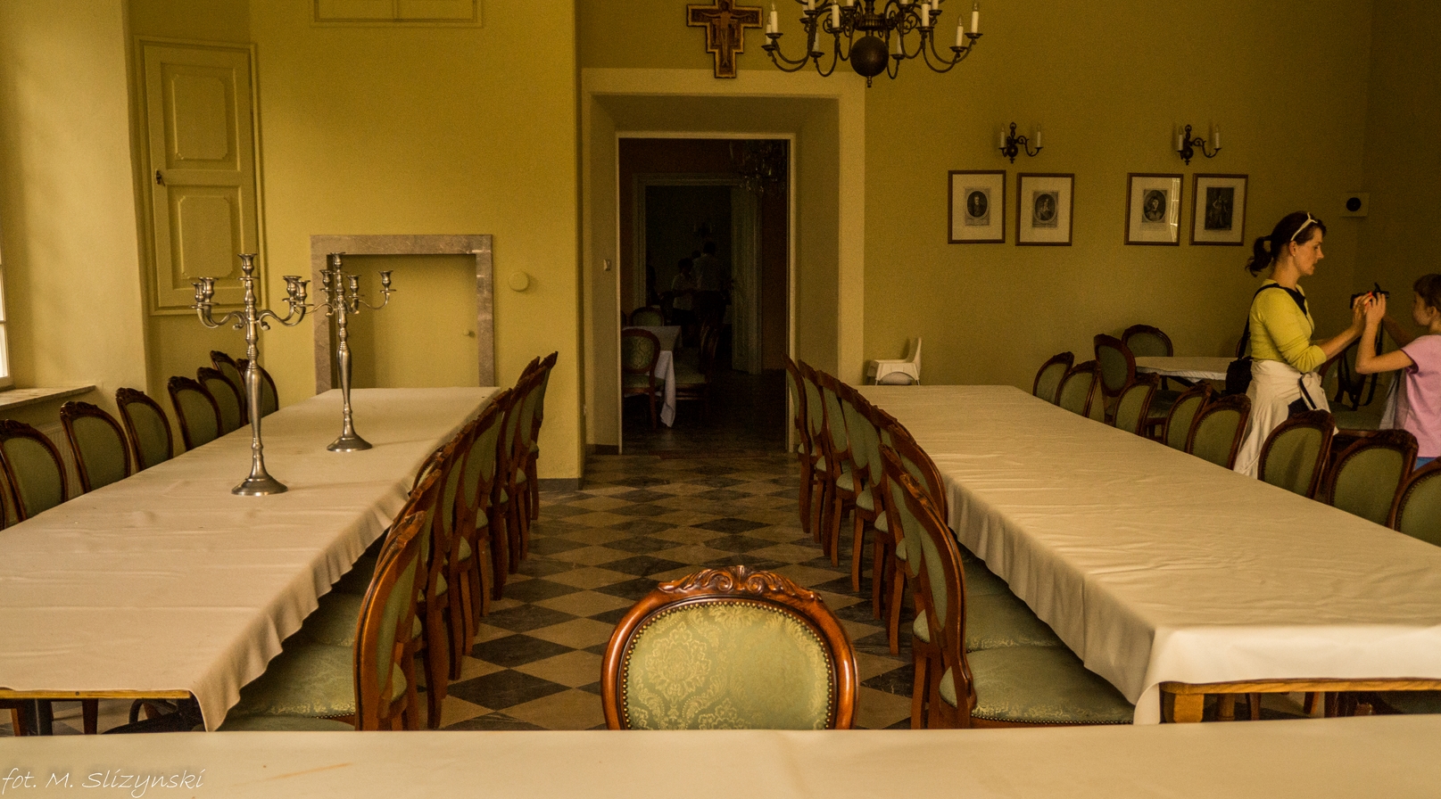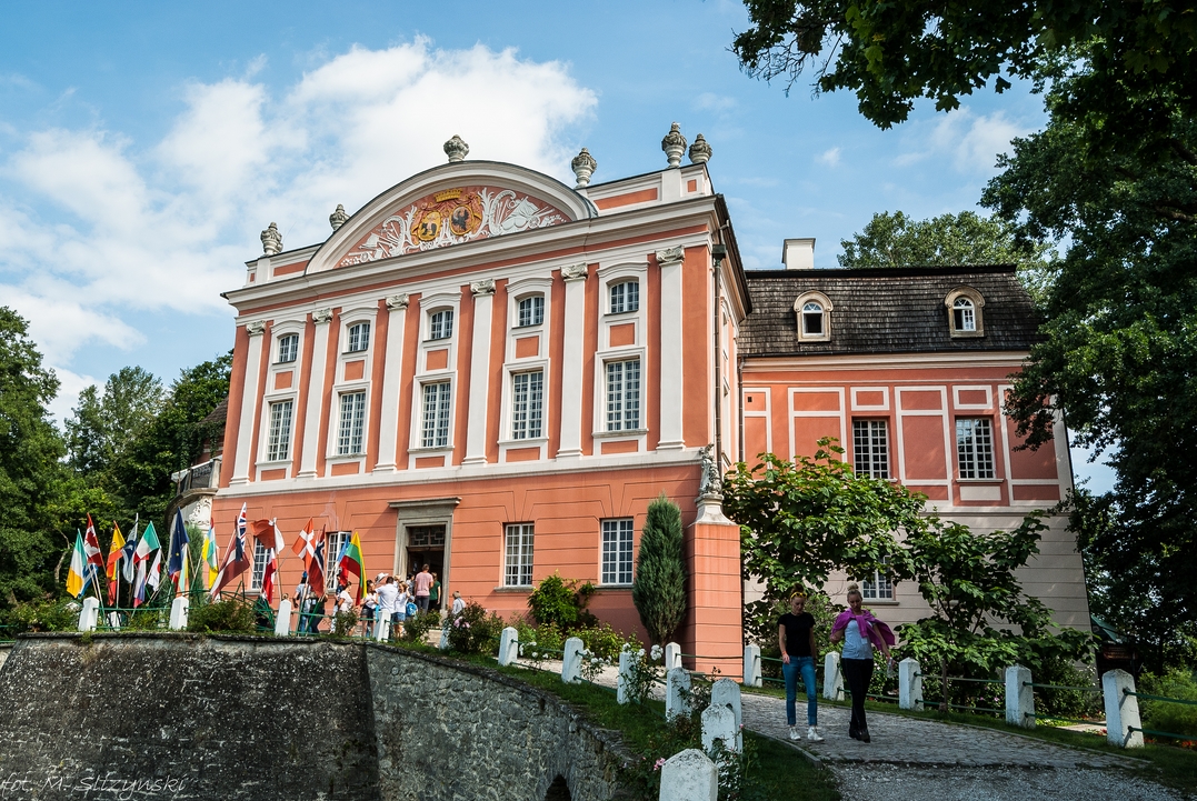 Przewodniczka, która miała oprowadzać nas po wnętrzach pałacu widziała całą sytuację pośród bizonów i poczekała, aż nasz powóz dotrze na miejsce. Gdy już do niej dotarliśmy zaczęła nam opowiadać historię tego pochodzącego z XVII wieku budynku. Piszę o XVII wieku, ale już w XIV znajdował się tu zamek. Spacerując pośród ciekawie urządzonych wnętrz, możemy dowiedzieć się o tym jak toczyło się tu życie gdy były one zamieszkane przez rodziny Lanckorońskich, Sołtyków i Popieli. Zresztą przedstawiciel tej ostatniej rodziny jest obecnie właścicielem tych terenów i zabudowań, choć mieszka w dużo skromniejszym niż pałac domku.
