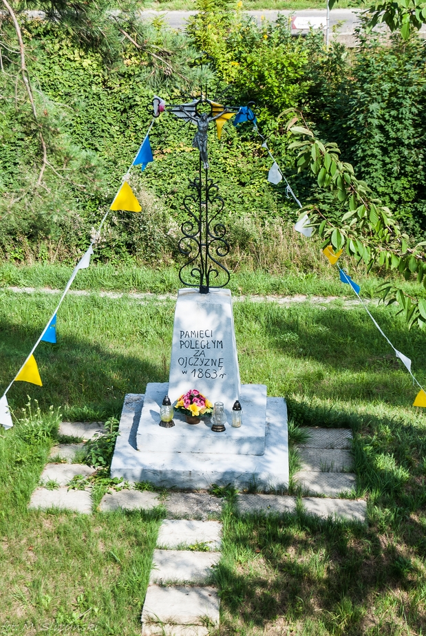 Kilkadziesiąt metrów za kościołem znajduje się krzyż upamiętniający zamordowanych w tych rejonach w 1863 roku powstańców styczniowych. A jak do tego doszło, otóż prowadzący z Rosjanami zażarte walki Powstańcy schowali się w miejscowej owczarni i stamtąd prowadzili obronę. Nie mogąc ich dorwać oprawcy podpalili budynek, a wszystkich uciekających z pożaru wystrzelali.